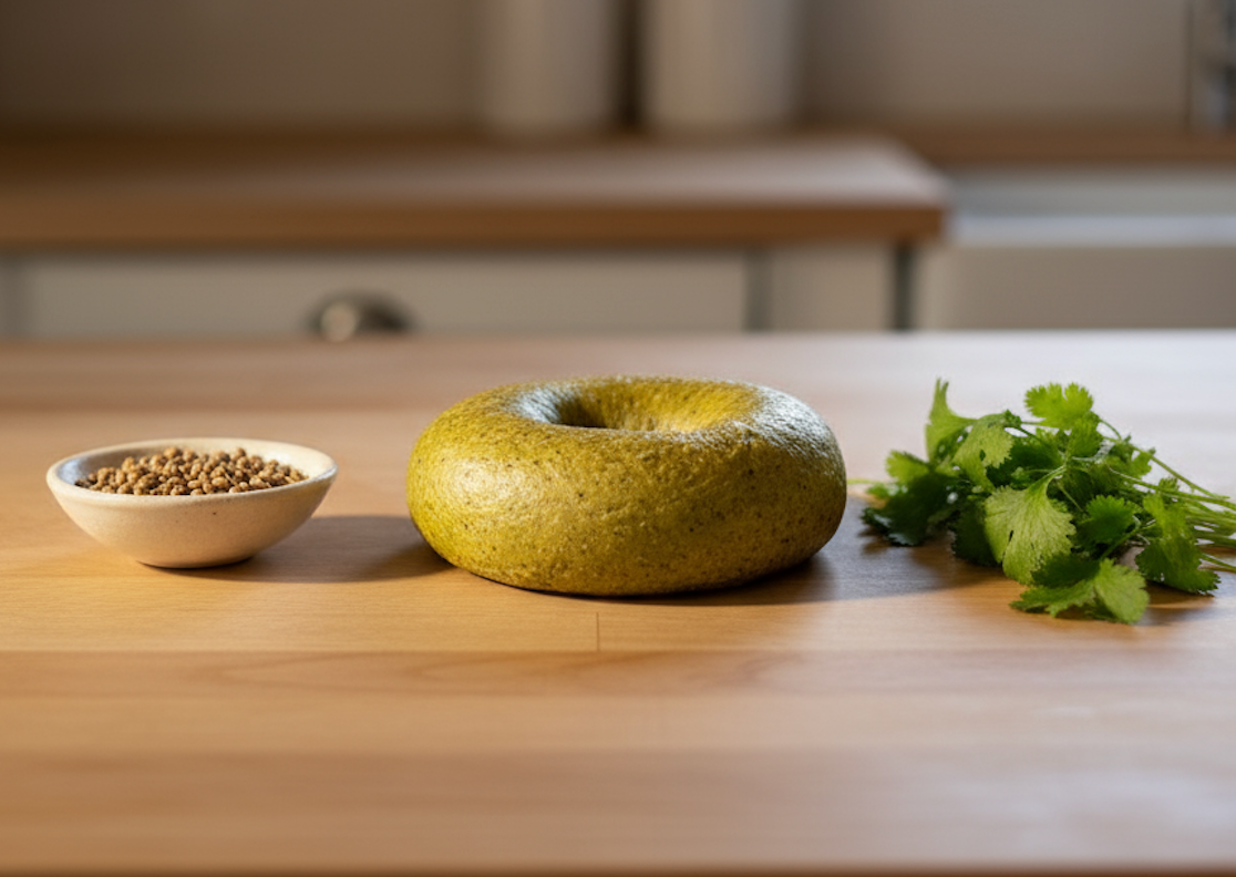 高筋麵粉 + 水 + 海鹽 + 麥芽糖 + 新鮮酵母 + 新鮮芫荽 + 芫荽籽