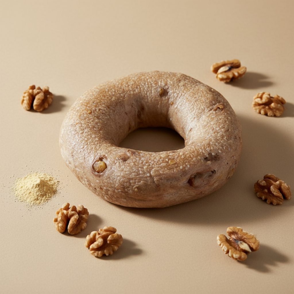 高筋麵粉 + 水 + 海鹽 + 麥芽糖 + 新鮮酵母 + 黑瑪卡粉 + 核桃