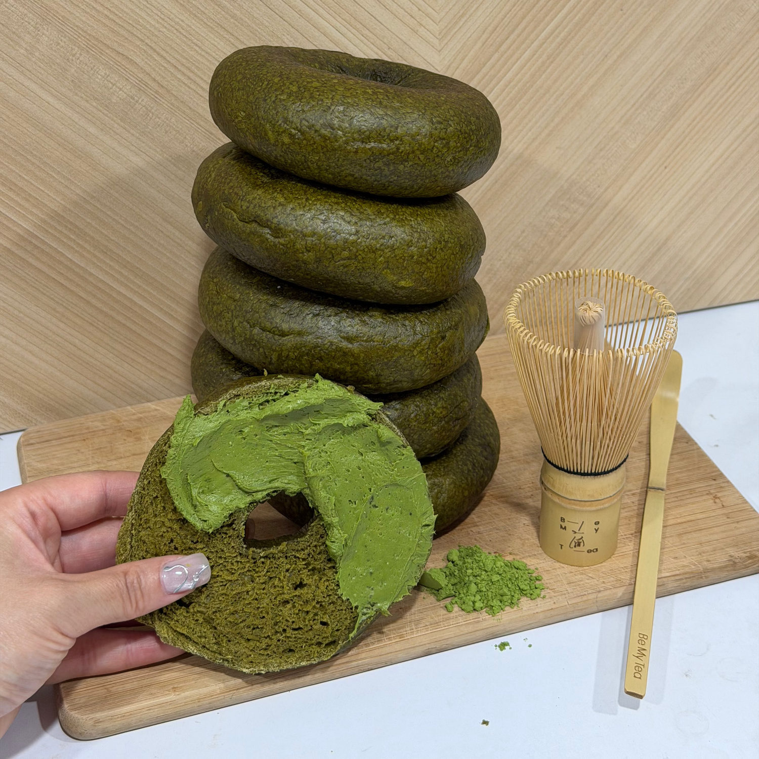 抹茶貝果: 高筋麵粉、水、海鹽、麥芽糖、新鮮酵母、抹茶粉。