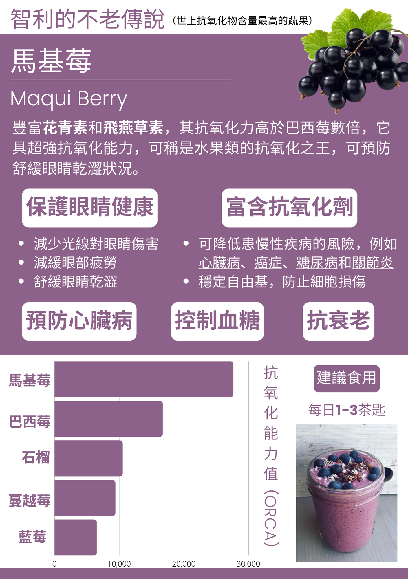 |   | 馬基莓 (Maqui Berry) | 巴西莓 (Acai Berry) |